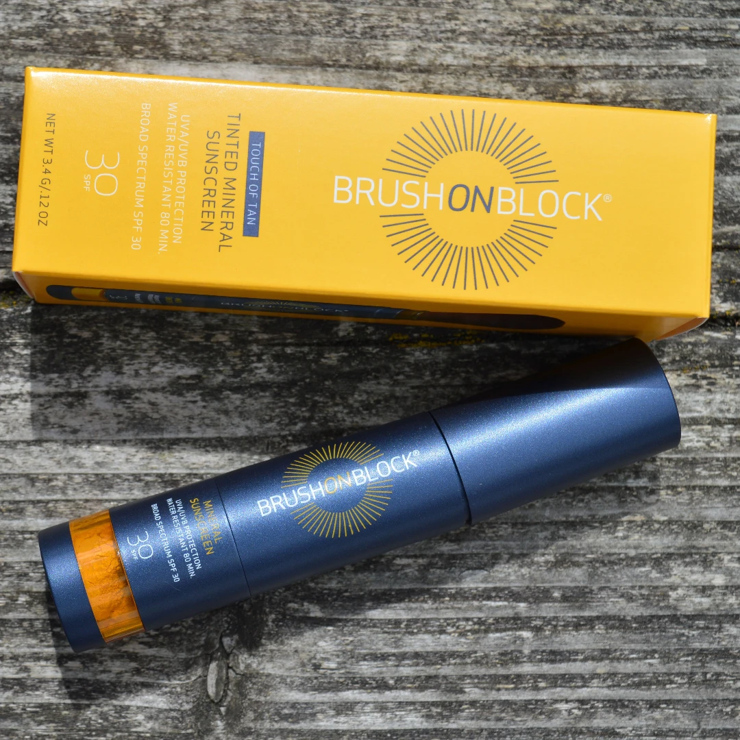 Brush On Block Brush On Mineral Sunscreen SPF30 Touch Of Tan contains mineral active sunscreen ingredients titanium dioxide and zinc dioxide to provide natural sun protection that you simply brush on, and when used as directed, provides some of the safest sun protection available. Featuring an easy, self-dispensing brush it can be reapplied with ease and be taken everywhere for effortless on-the-go protection whenever you need it. Water-resistant for up to 80 minutes, it is perfect for daily activities including swimming, walking, and running, and has been formulated without any chemical sunscreen actives, therefore it is safe for both humans and marine life. Featuring a slight warm tint, Touch Of Tan will give light to medium skin tones a natural sun-kissed glow. Vegan, cruelty-free, and gluten-free.
