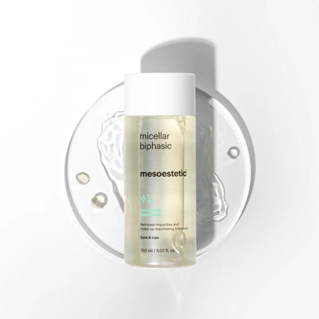 mesoestetic Micellar Biphasic is an effective makeup remover with especially high tolerance for the eyes and lips. This micellar oil is combined with a plant oil rich in omega 6. This gently removes dirt, impurities and waterproof makeup whilst being especially gentle around the eyes and lips. Â