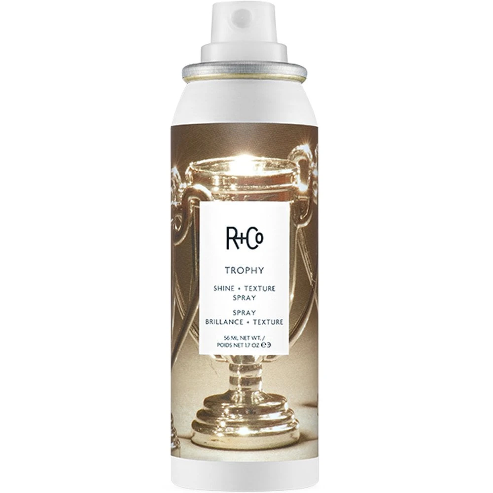 Add just the right amount of texture, volume, and shine to all hair types with R+Co Trophy Shine + Texture Spray. This illuminating hair spray helps locks appear younger and more luminous, and is infused with Sea Kale and Sweet Almond to impart the hair with intense moisture and shine without weighing it down.Â