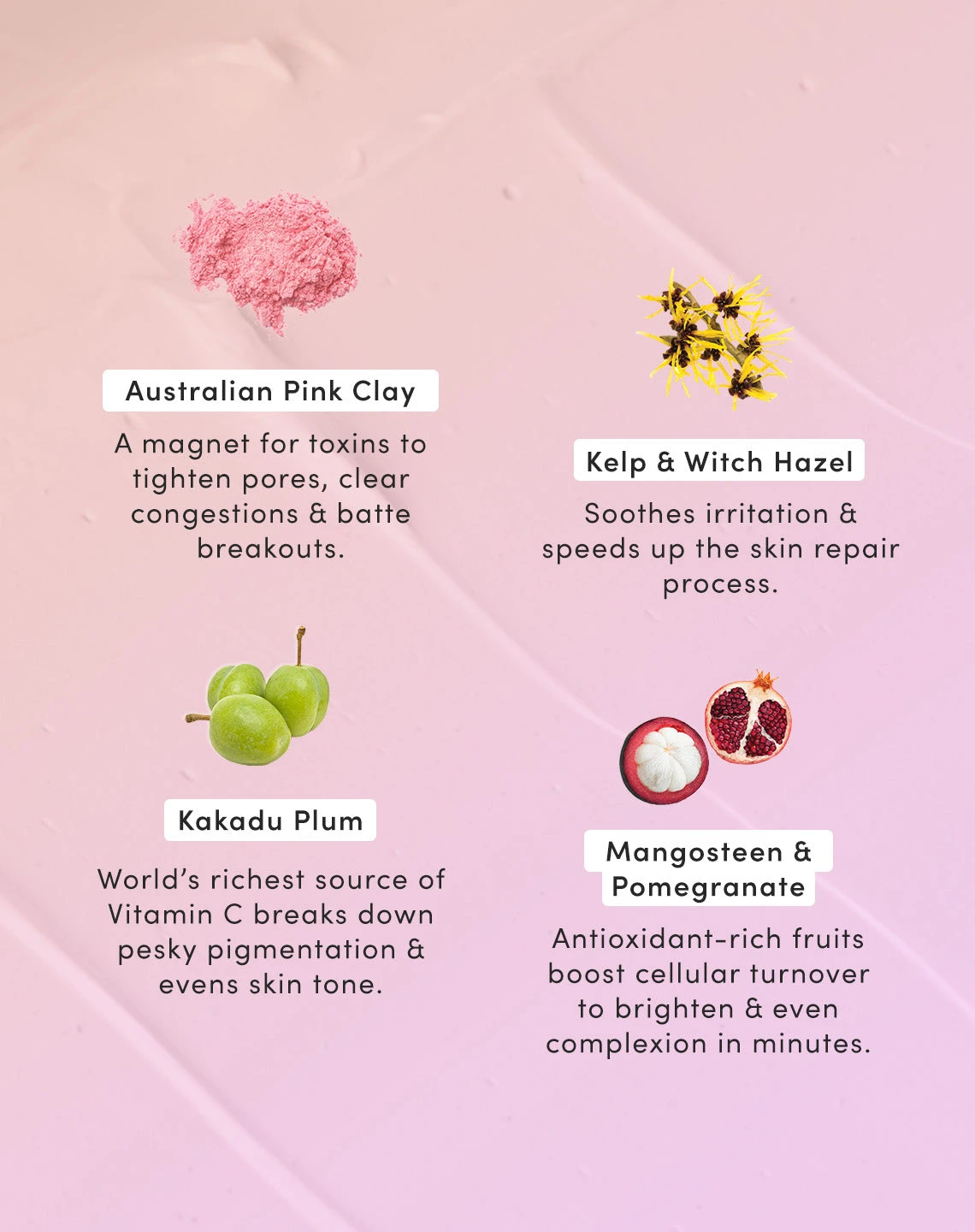 Watch your pores shrink in just 10 minutes, as this mask deeply detoxifies your skin, drawing out impurities, toxins, and pollutants that can be left from everyday environmental stressors. With a formulation of powerhouse ingredients including Kelp and Witch Hazel to refines your pores and sooth irritation, antioxidant-rich Mangosteen and Pomegranate to bright and even your complexion, and Kakadu Plum to break down pigmentation.