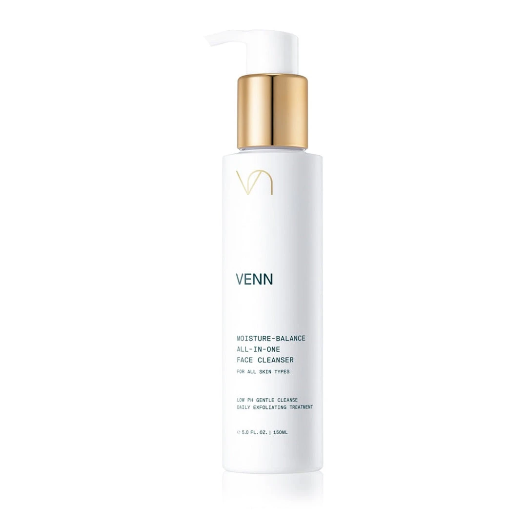 VENN Skincare Moisture-Balance All-In-One Face Cleanser is formulated without surfactants and uses humectants to deeply cleanse the skin, while keeping skin soft and moisturised. The gentle formula is suitable for all skin types and in just one step deeply cleanses, removes makeup and any buildup of dead skin cells and gently exfoliates.Â